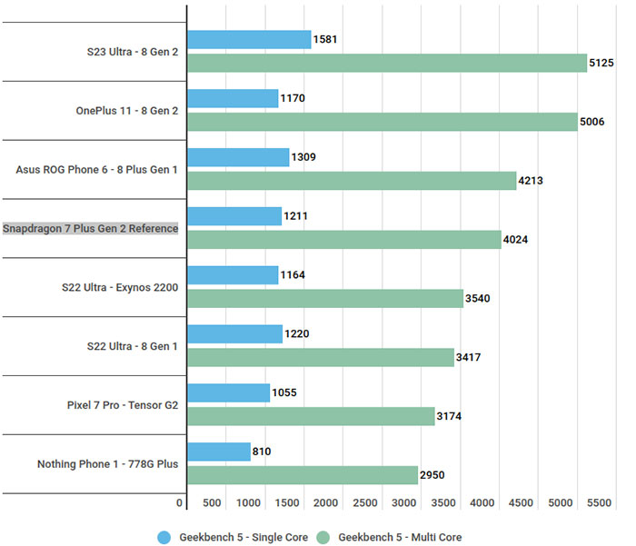 Как видно на опубликованных графиках, в GeekBench 5 прототип смартфона на чипе Snapdragon 7+ Gen 2 набрал 1211 и 4024 балла в одноядерном и многоядерном тестах соответственно, обойдя Galaxy S22 Ultra на платформе Exynos 2200, Galaxy S22 Ultra на Snapdragon 8 Gen 1, Pixel 7 Pro на Tensor G2 и Nothing Phone 1 на Snapdragon 778G+.